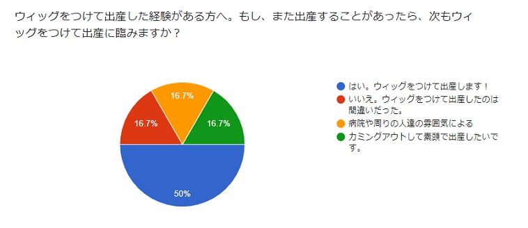 ウィッグを外したかどうかのアンケートの結果です。このようにウィッグを外すか外さないかは、ほぼ半々ですね。どちらにせよメリットとデメリットがありそうです。因みに4年前に息子を出産した私は、ウィッグをルームキャプに被り変えて出産に挑んだ「外す派」です。